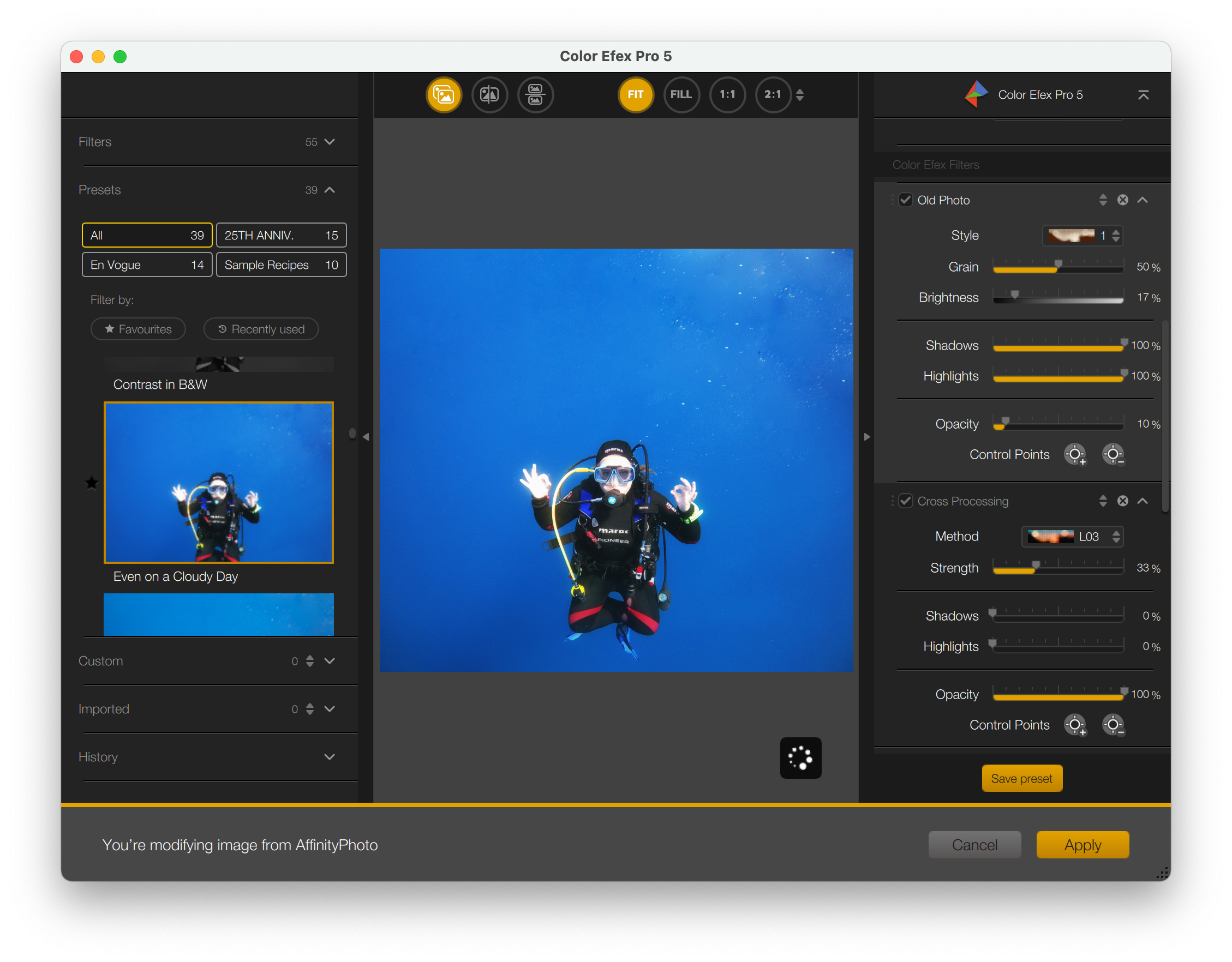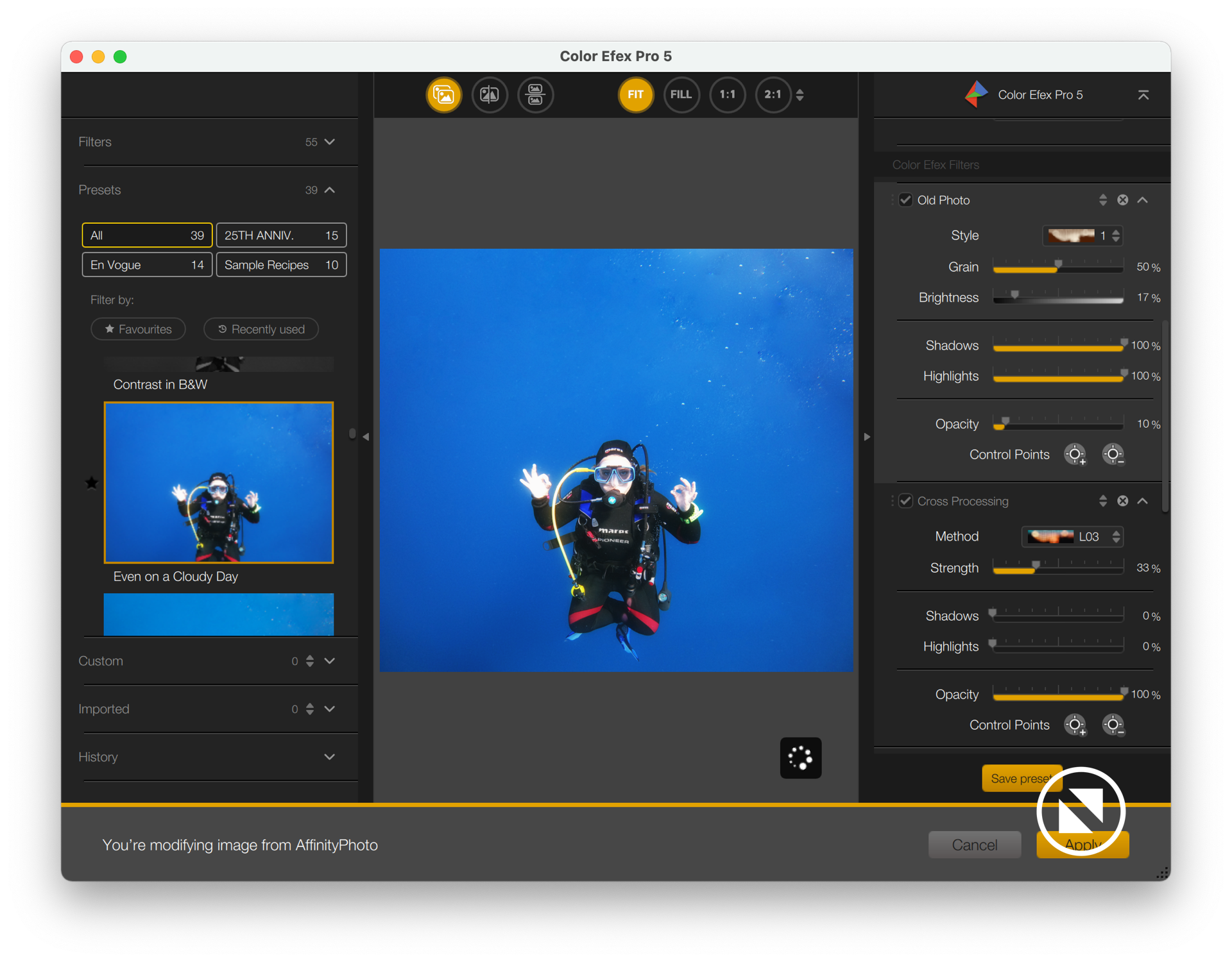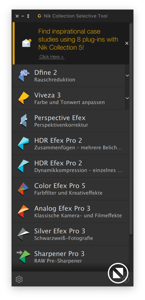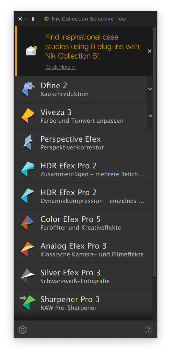 Die Nik-Collection 5 läuft auch problemlos in Affinity Photo. Einzige Ausnahme ist Perspective Effex. Diese Funktionen fehlen in Affinity Photo.