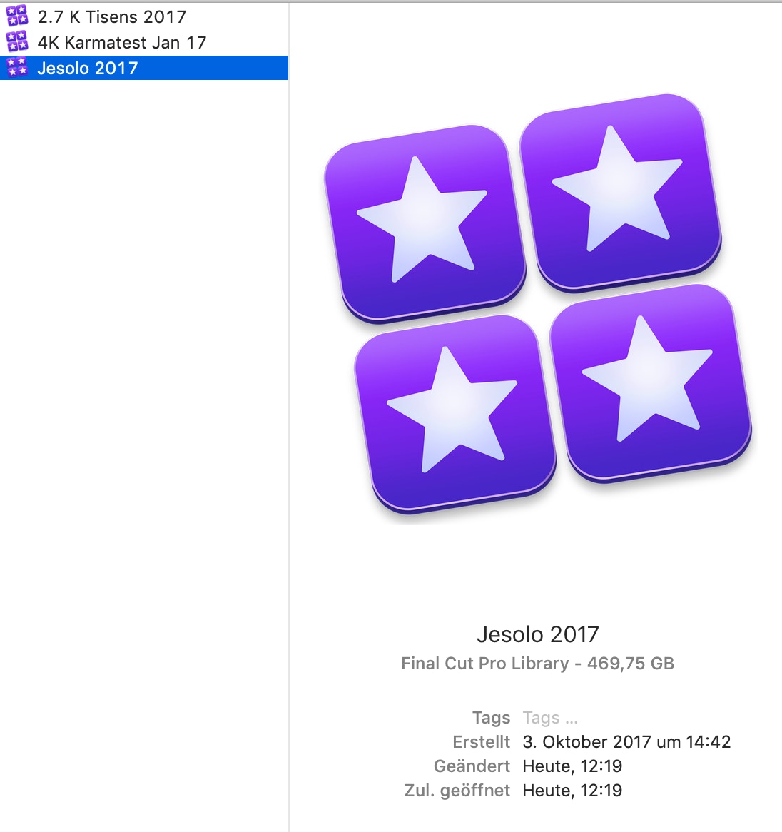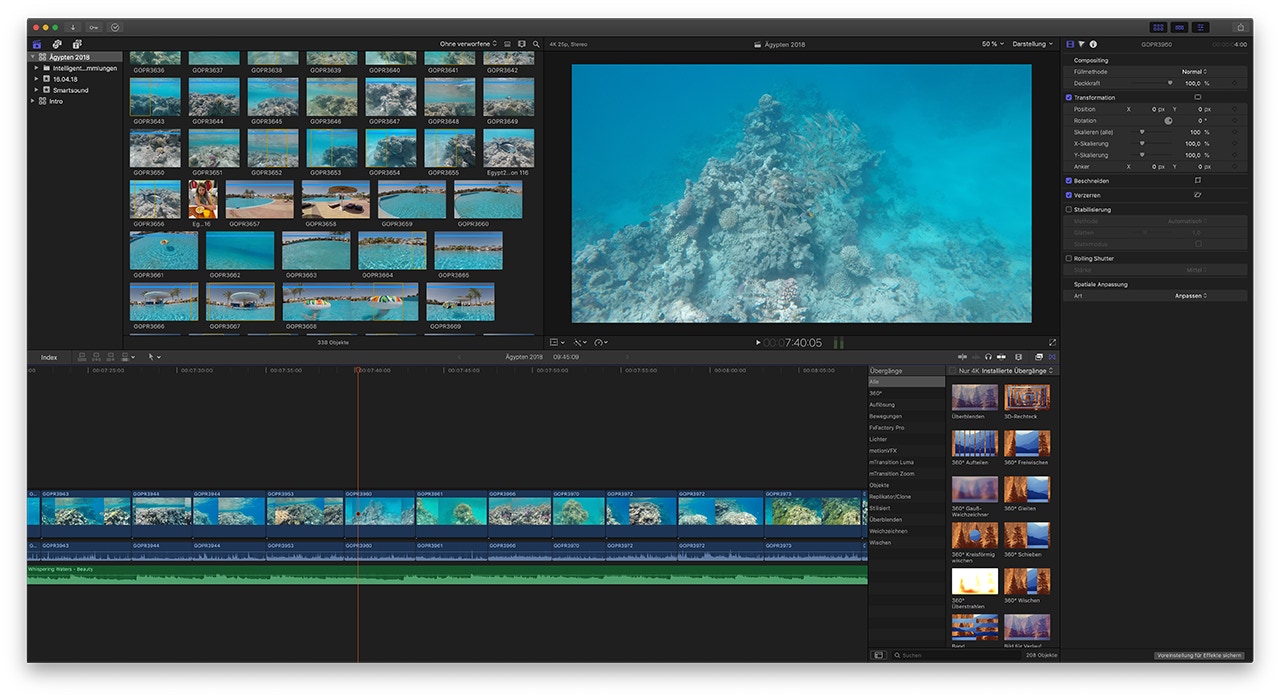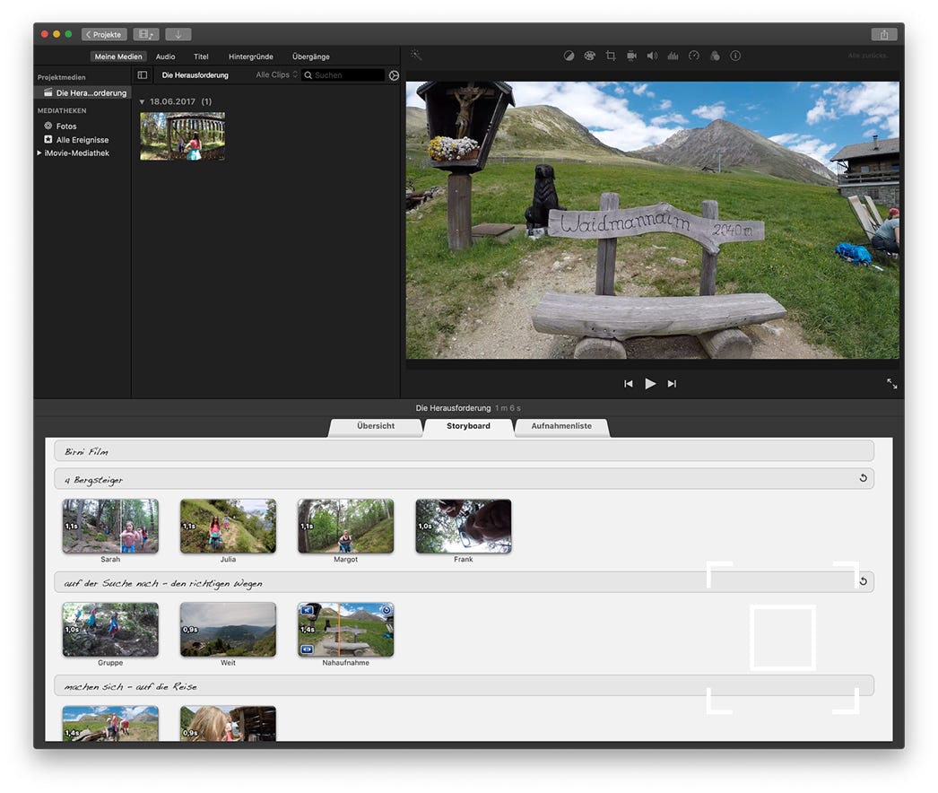 Mittlerweile nutze ich iMovie nur noch wenn ich bewußt kurze Filmchen schneiden will, meist dann wenn einfach viel zu wenig Ausgangsmaterial zur Verfügung steht. Dennoch bietet iMovie auch für längere Filme ein hervorragendes Schnitt-Tool für Einsteiger. Die gute Übersicht und die fehlende Überfrachtung ergibt ein schnelles Einarbeiten und somit schnelle Erfolge. Die wichtigsten Dinge sind an Board. So finden sich neben ausreichender Blenden (Übergänge) und Hintergründe (sogar animierte Karten), Titel auch etliche Verbesserungs- und Veränderungsmittel. Farbbalance, Farbkorrektur, Beschneidung, Bildstabilisierung, diverse Audioeinstellungen (Rauschunterdrückung und Lautstärke), Geschwindigkeit (z.B. Zeitlupe) stehen zur Verfügung. Eine Ausgabe ist bis zu 4K möglich und kann z.B. direkt zu Facebook oder Vimeo exportiert werden. Natürlich ist auch ein Export als Datei möglich.
